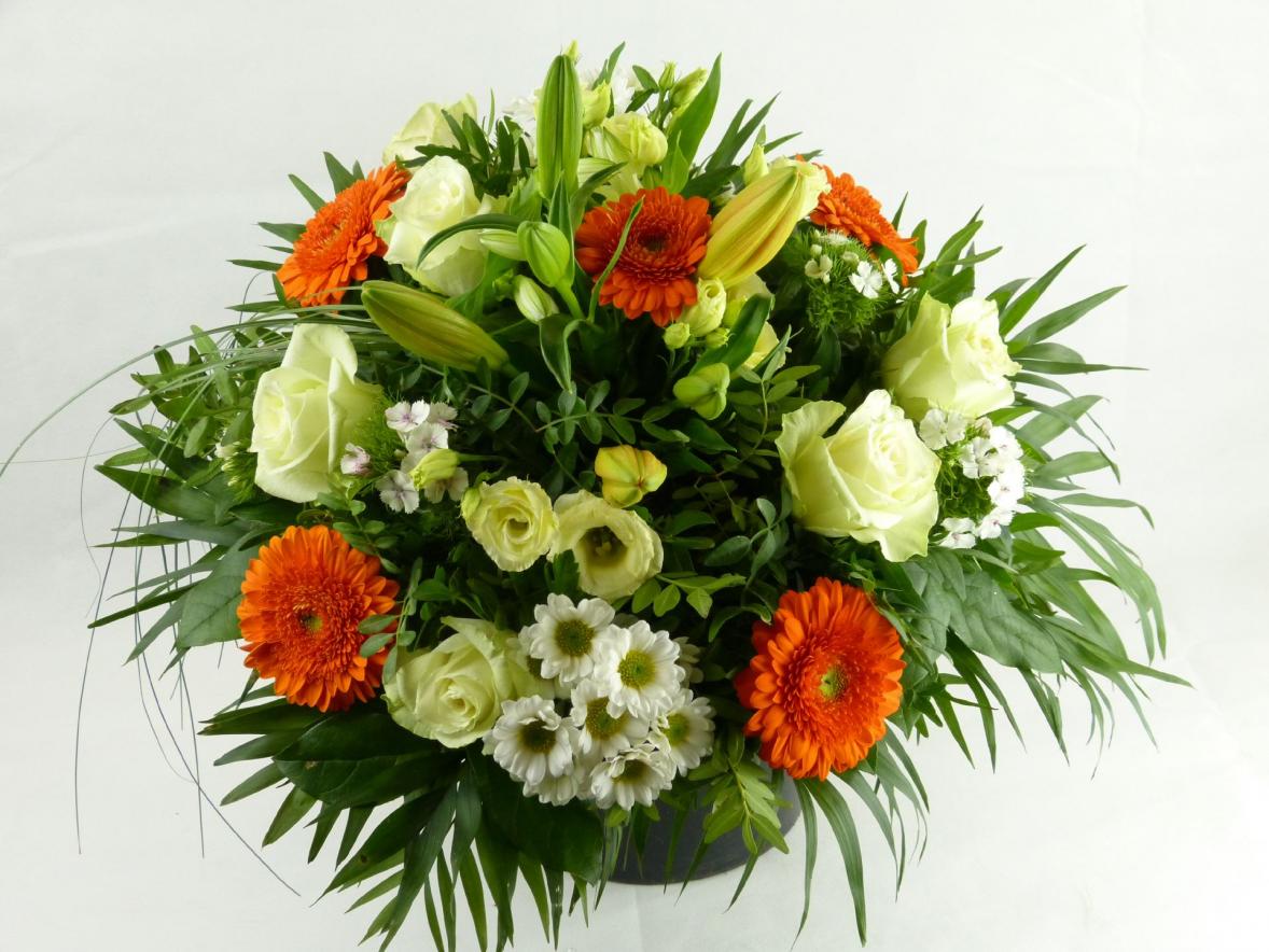 Die orangen, Lilien und Gerbera kommen toll zur Geltung durch den sonst in weiß gehaltenen Blumenstrauß.