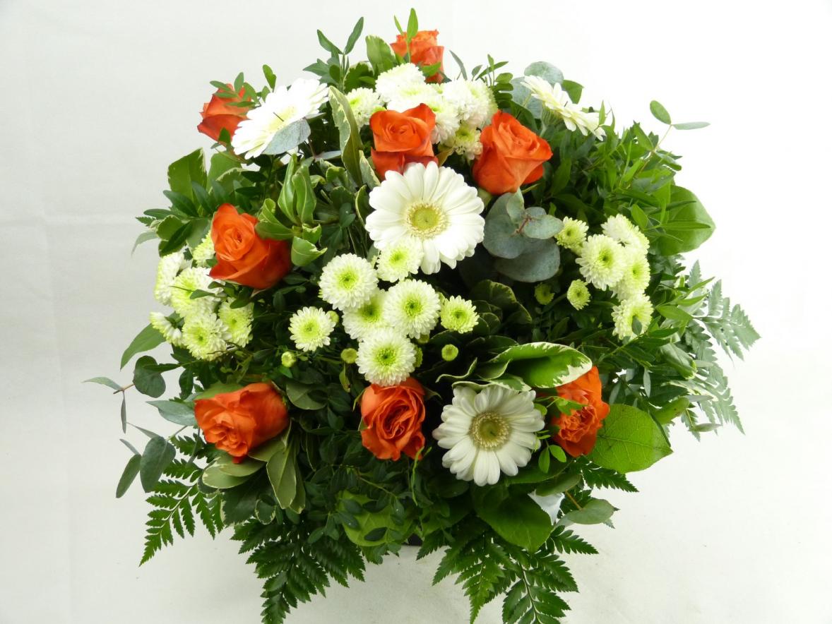 Ein fröhlicher Blumenstrauß, einfach schön mit orange Rosen, weißen Mico und Germini mit tollem verschiedenen Beiwerk.
