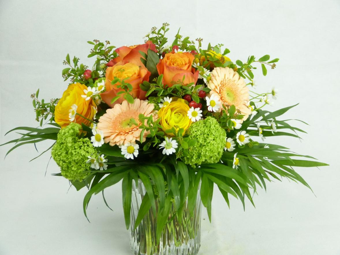 Gebunden aus Rosen, Germini, Ranunkeln, Hypericum, Viburnum, Kamille,