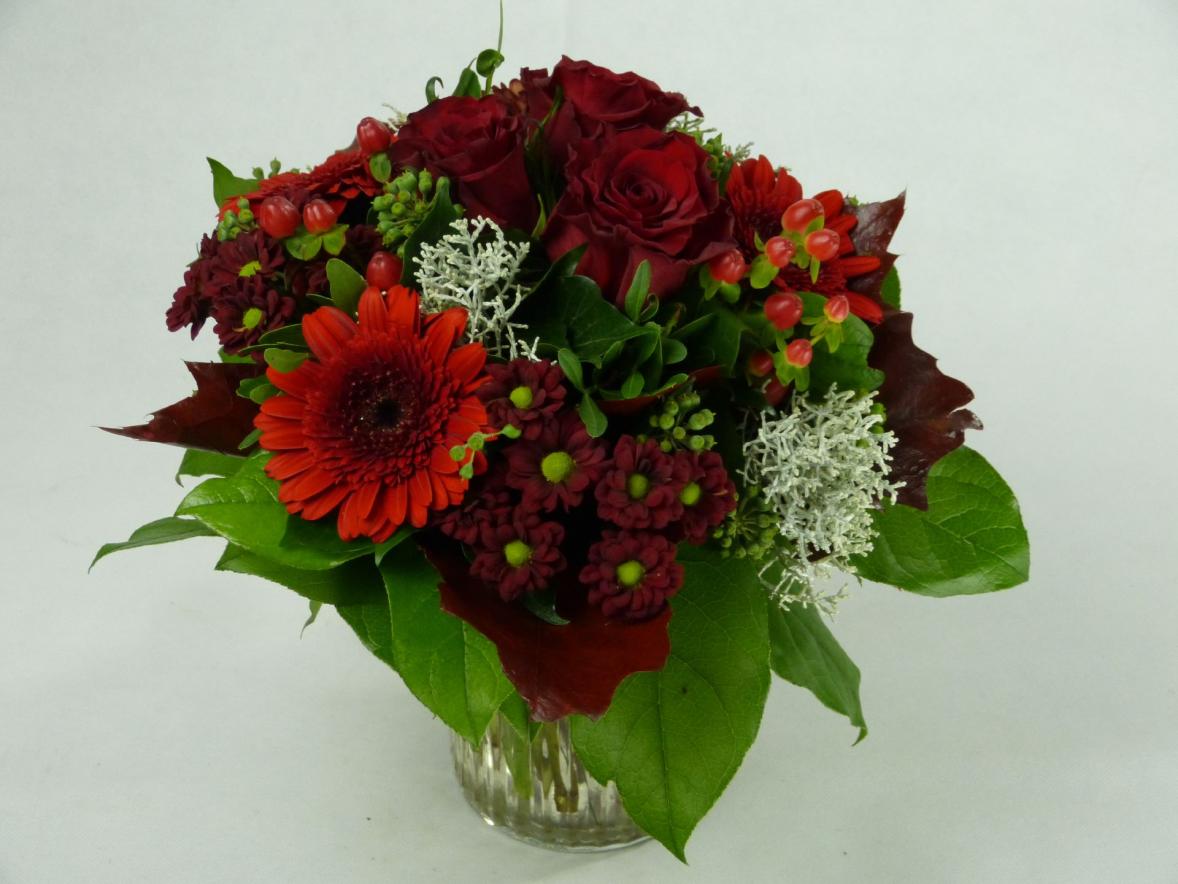 Die Liebe kennt keine Jahreszeit unsere Blumen schon. Unsere Floristen haben für Sie diese wunderschöne herbstliche Liebesbezeugung kreiert aus Rosen, Germini, Santini, Hypericum, Eichenlaub, Chalocephalus, Efeu, Pistazie und Salal. Das Bild zeigt die Variation für 23,00€. Die Vase ist im Preis nicht enthalten.