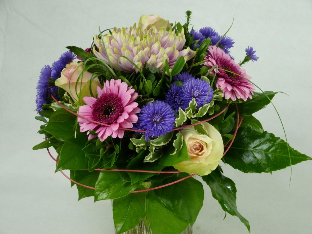 Ein bisschen Farbe in den Alltag, da lacht das Auge. Mit einer schönen Deko-Chrysantheme, Rosen, Germini, Astern, Pistazie, Efeu, Salal, Bärgras und Aralien einfach Toll.