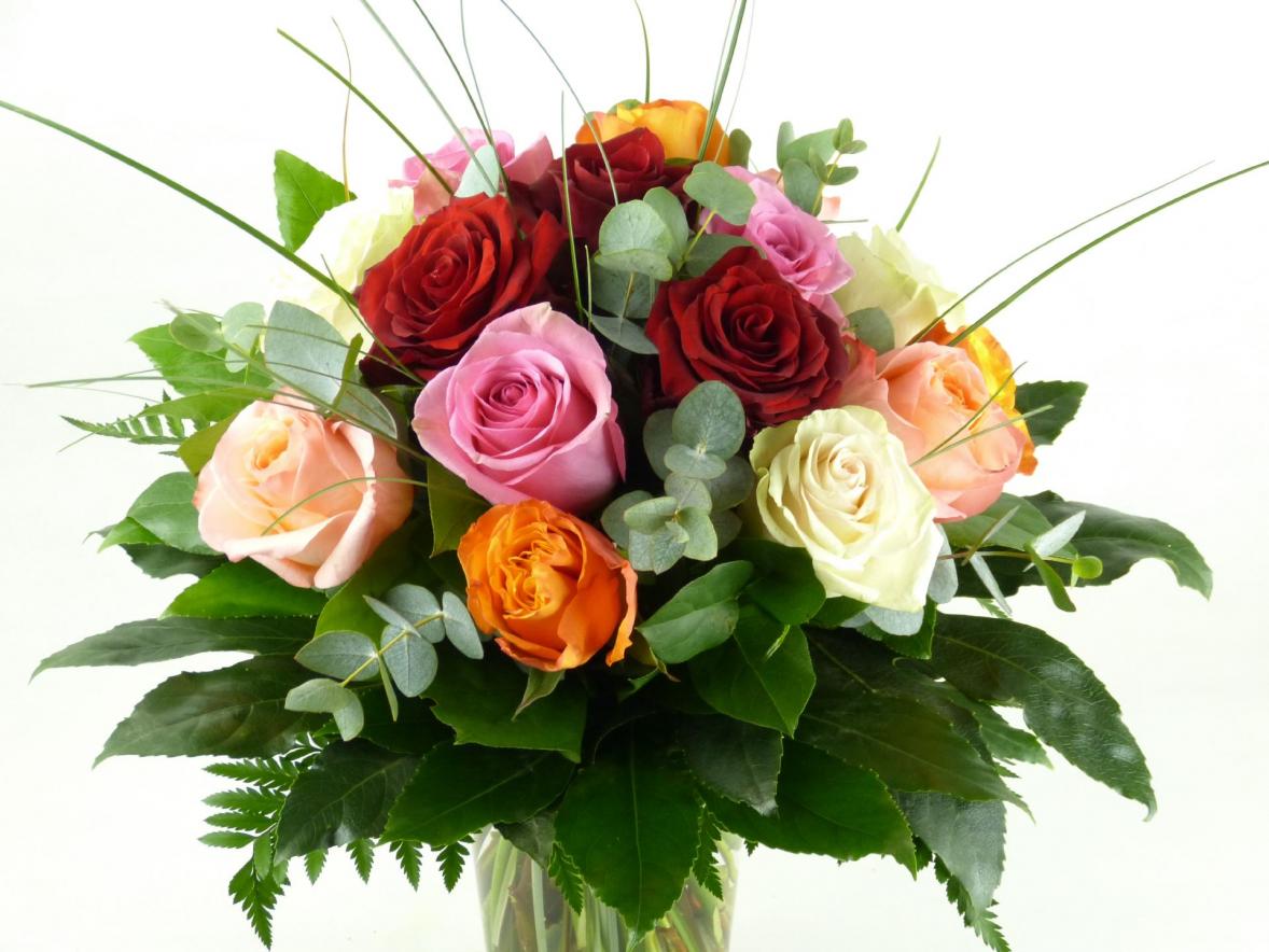 Die schönste Art Freude zu bereiten. Bunte Fairtrade Rosen. Kurz aufgebundener Strauß mit 10, 15 oder 20 Rosen mit Eukalyptus, Bärgras, Aralienblätter und Lederfarn.