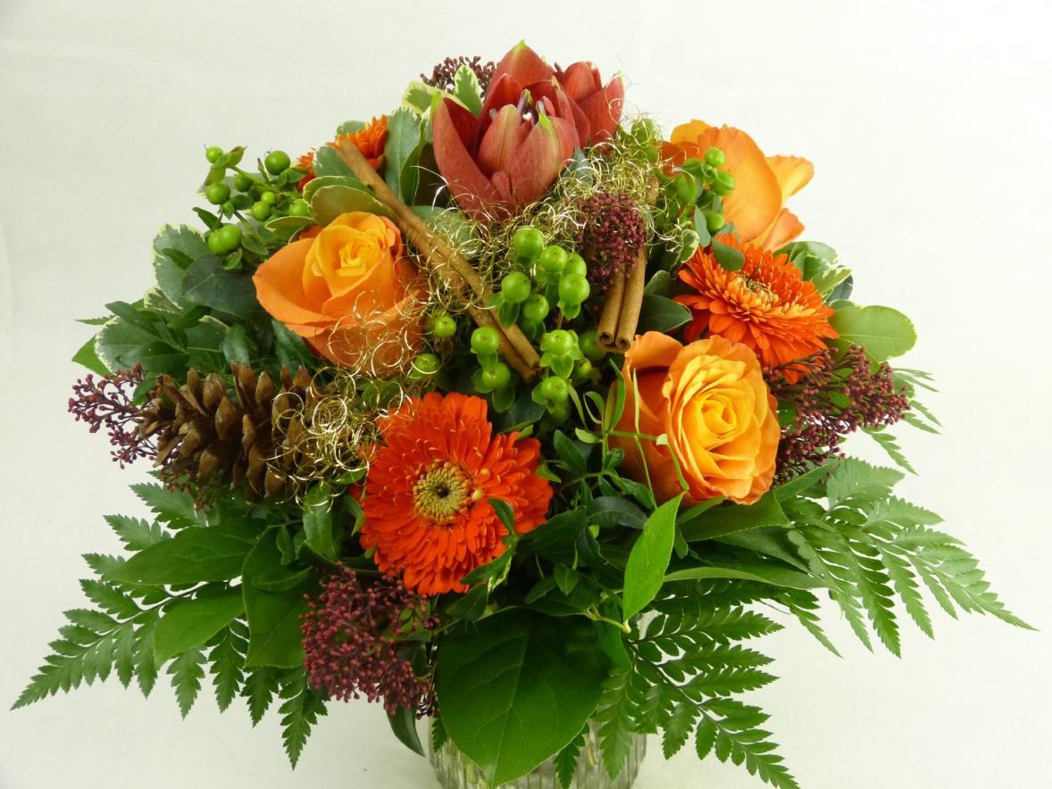 Ein kurz gebundener Strauß mit Rosen, Germini, Amarillys, Hypericum, Skimmie, Efeu, Salal, Zapfen, Zimt und Engelshaar.