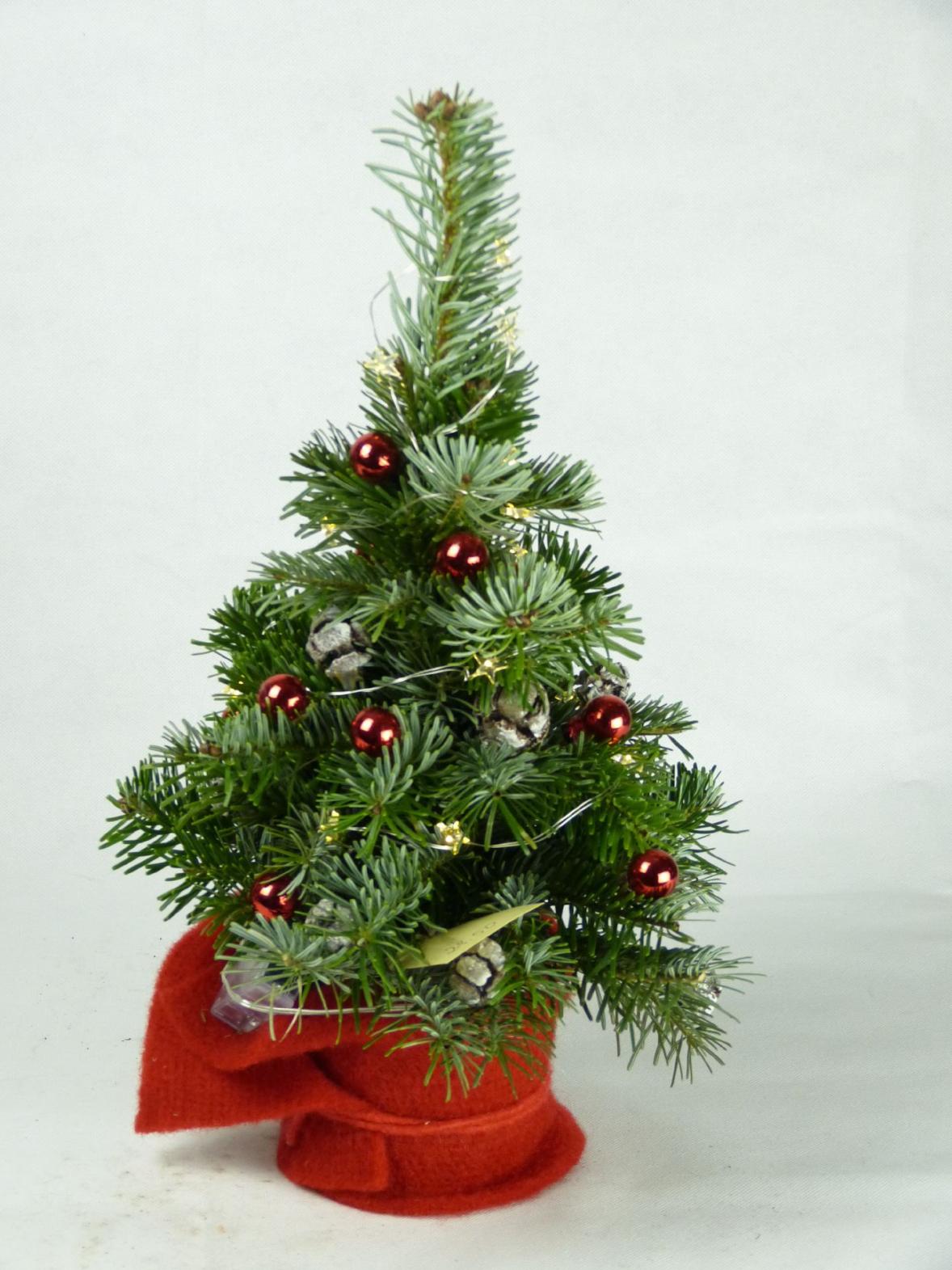 Christbäumchen geschmückt in der größe von 40cm mit Topf. Christbaumschmuck mit Lichterkette, Kugeln, Cupressus Zapfen und Filzmanschette.