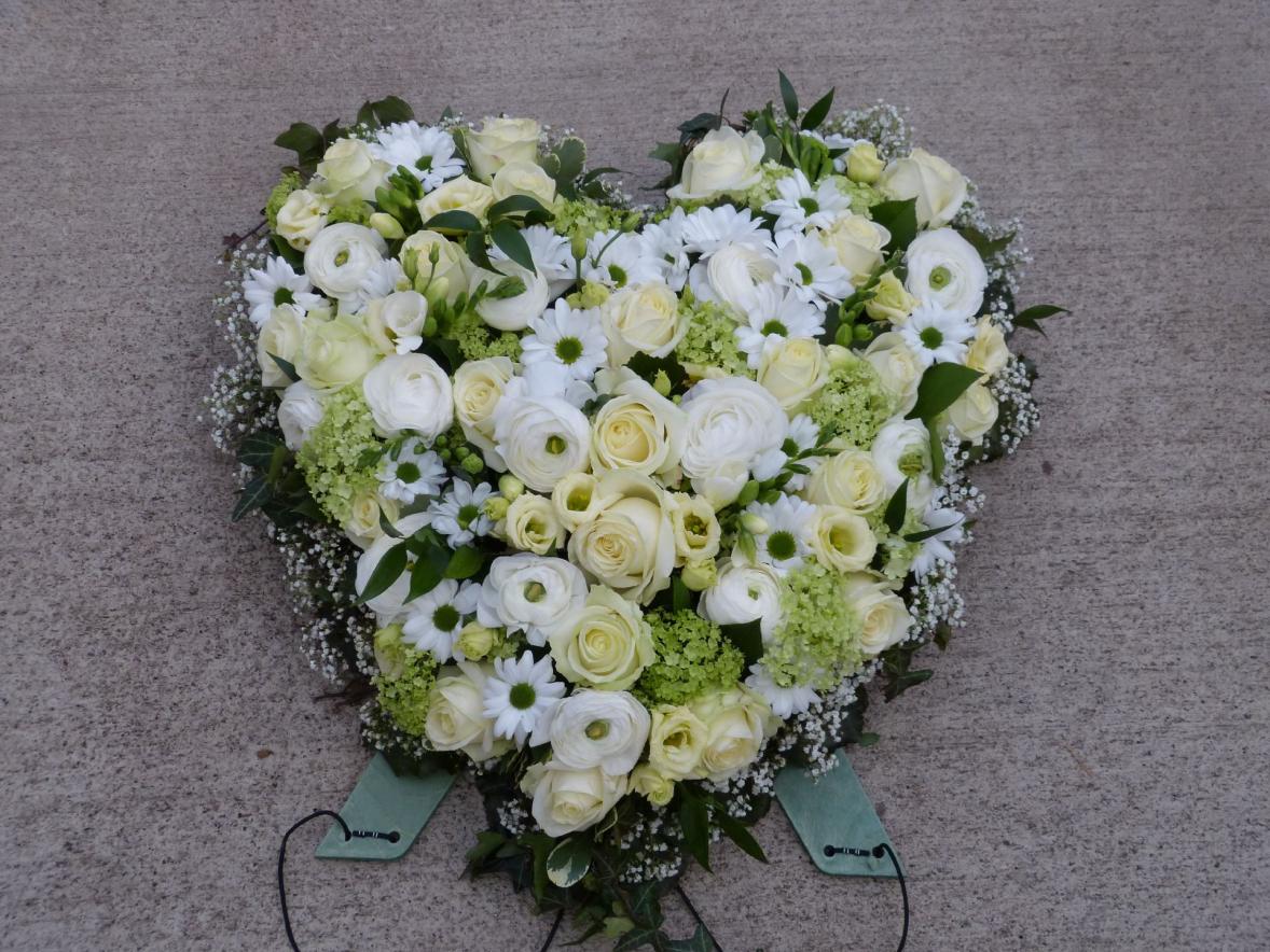 Das Herz ist gesteckt aus weißen Rosen, Ranunkeln, Freesien, Lysemachia, Mico und Beiwerk.