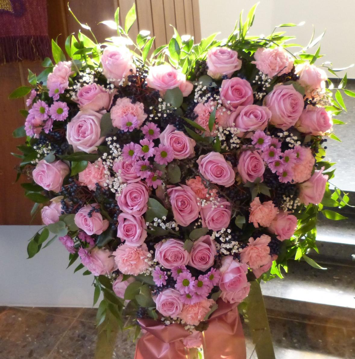 Das Herz ist gesteckt aus rosa Rosen, rosa Nelken, Mico und Beiwerk.