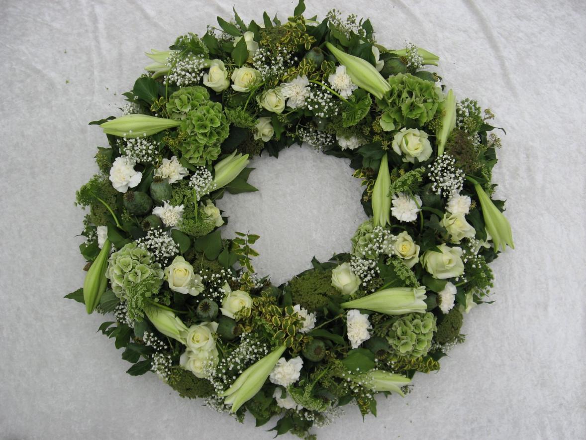 Der Kranz ist gesteckt aus weißen Lilien, weißen Rosen, weiße Nelken und Beiwerk.