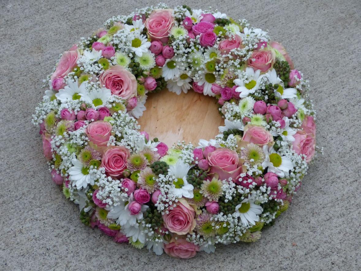 Ruhe in Frieden, Urnenkranz auf Holzunterlage im Durchmesser von 40cm.