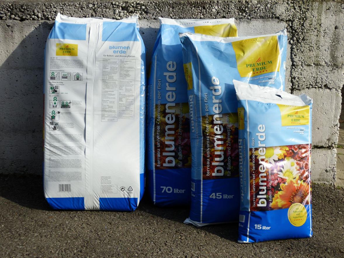 Premium Erde, Blumen-Erde gebrauchsfertiges Kultursubstrat in den Größen 15 Liter, 45 Liter und 70 Liter.