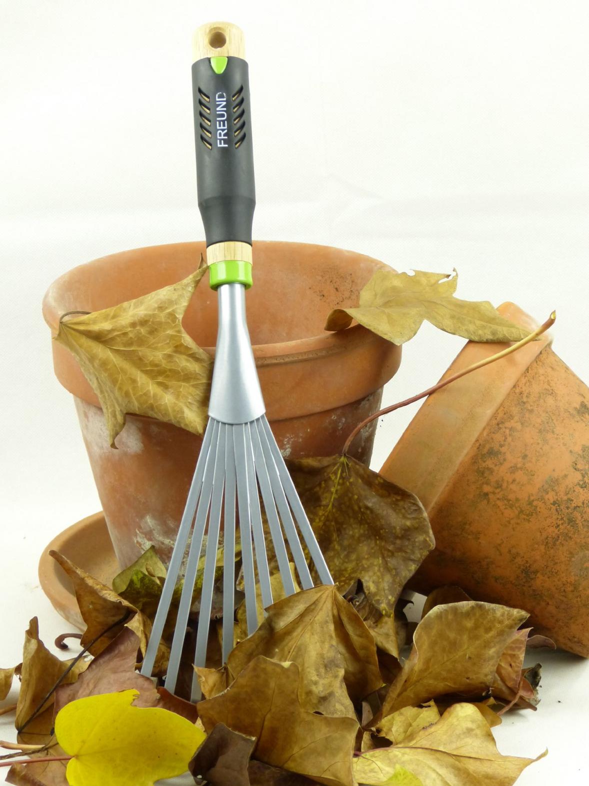 Hand-Laubrechen mit flachen Zinken. Die Arbeitsbreite des Laubrechens beträgt 14cm und das Werkzeug hat eine Gesamtlänge von 40cm.
