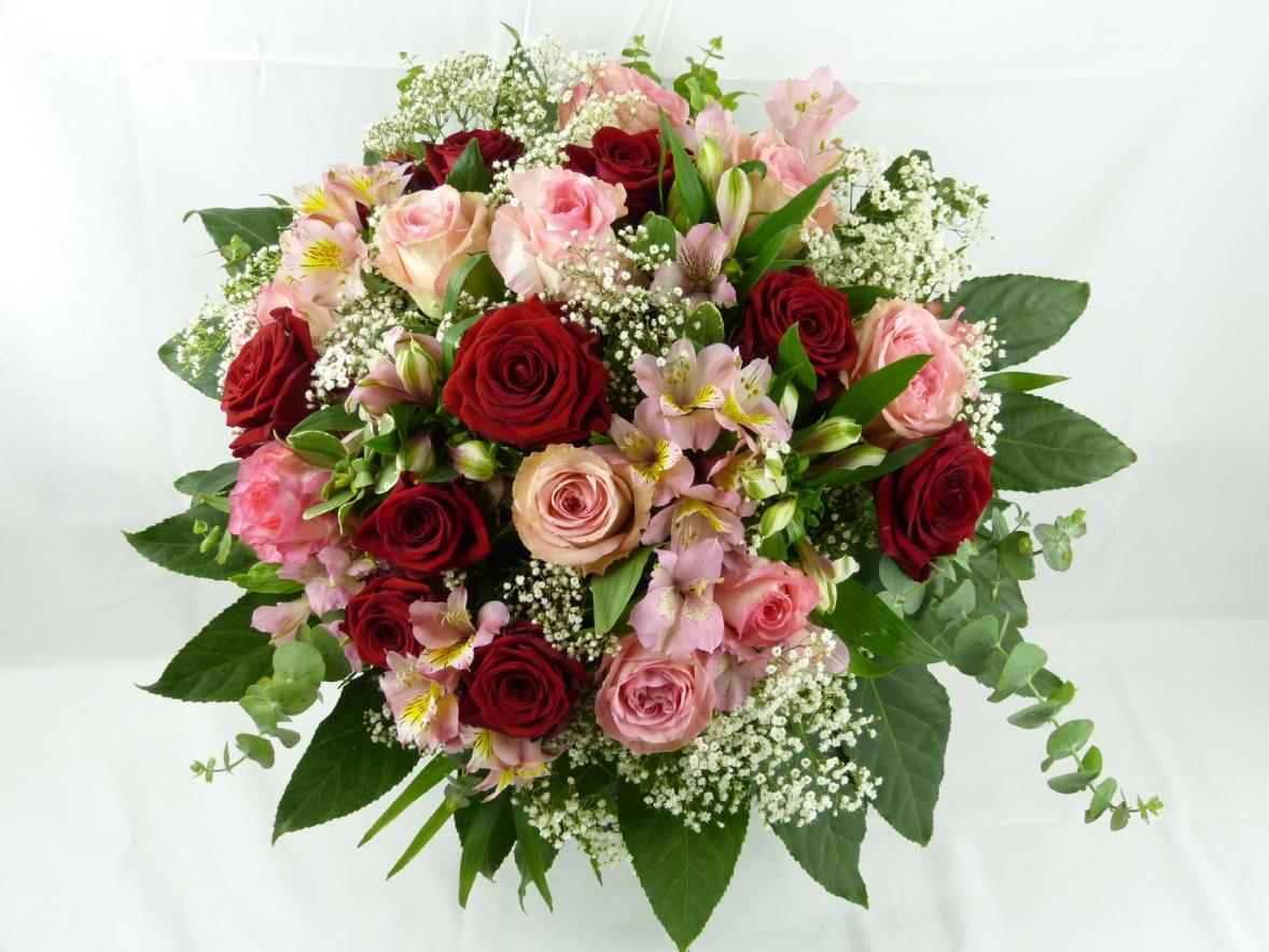 Alstromerien in rosa, Schleierkraut, Rosen in rosa und rot und Beiwerk das sie Blumenauswahl wunderbar in Szene setzt.