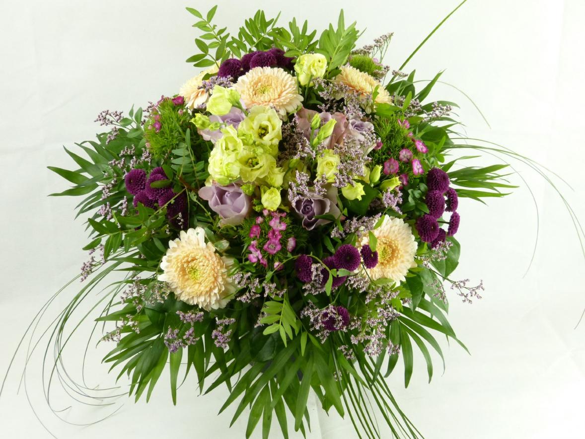 Die Zutaten: Rosen, Gerbera, Lysianthus, Mico, Limonium, Bartnelken, diverses Grün, die Kreativität und Handwerkskunst einer
