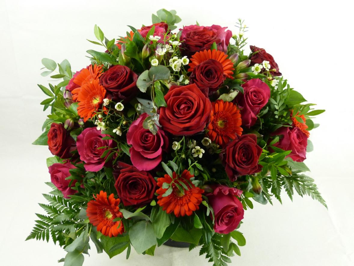 Der Name und das Bild sagen alles. Gefertigt aus roten und pink Rosen, roten Germini, Waxflower mit verschiedenem Grün, wunderbar rund aufgebunde.