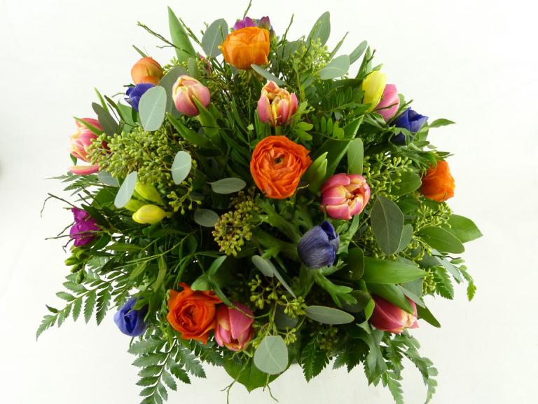 Gebunden ist der Blumenstrauß aus Anemonen, Ranunkeln, Tulpen und Freesien und diversem Beiwerk.