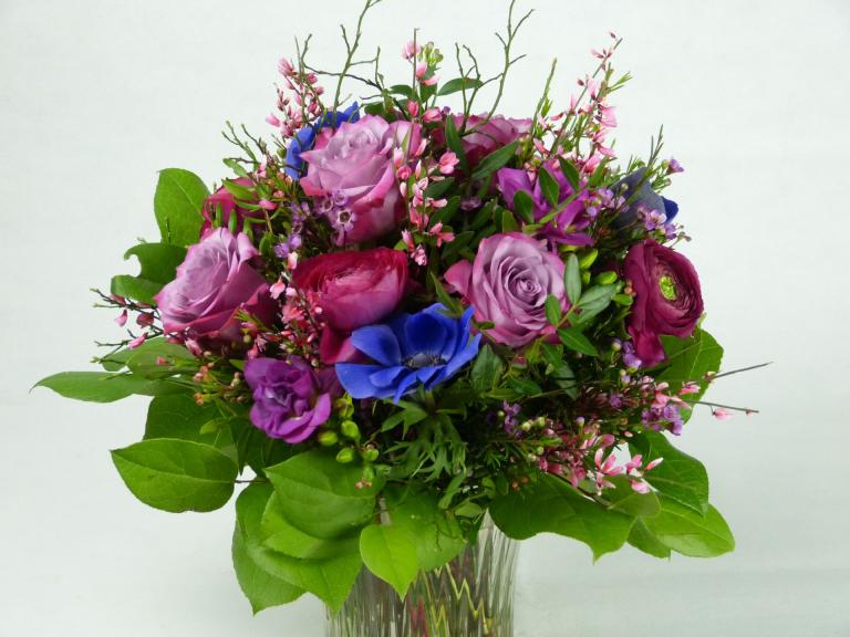 Toll aufgebunden mit Rosen, Ranunkel, Ginster, Waxflower, Heidelbeer, Pistazie, und Salal.