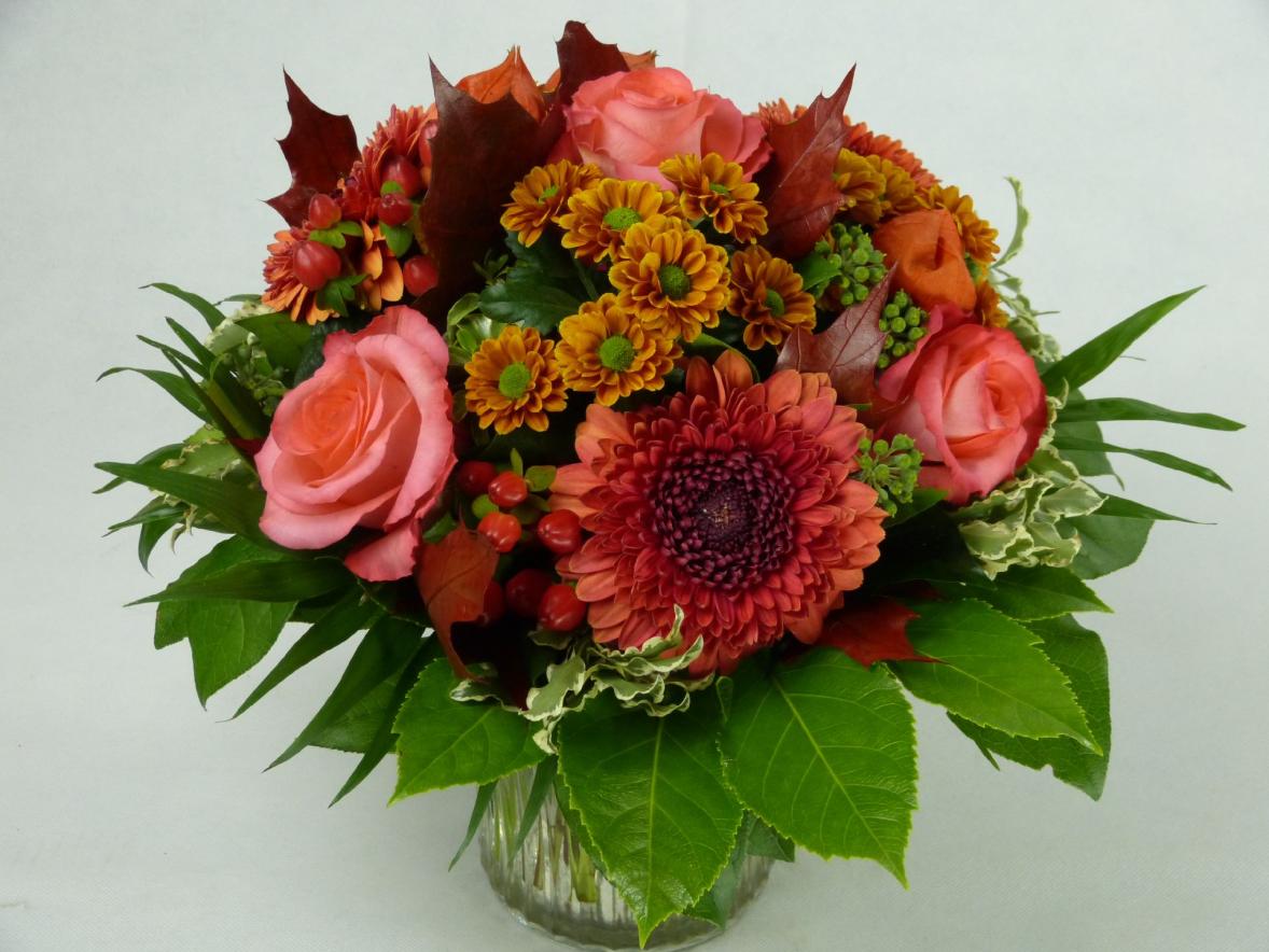 Ein Blumenstrauß wie wenn die Sonne orange-rot untergeht und vom nächsten schönen Tag kündet. Gebunden aus Rosen, Germini, Santini, Hypericum, Eichenlaub, Efeu, Pittosporum, Salal, Chicco, Aralien und Physalis.