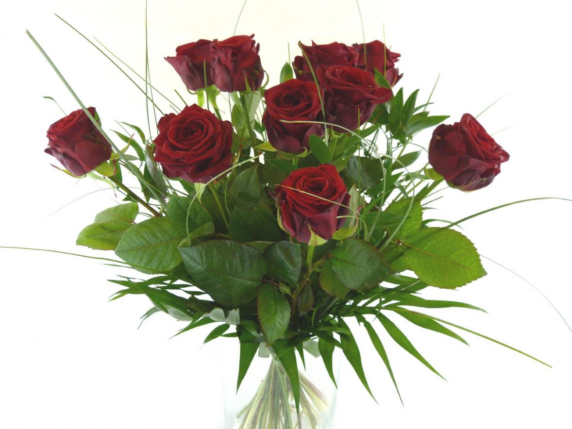 Mit Rosen sagen: ICH LIEBE DICH oder einem lieben Menschen danke sagen. Lang aufgebunden mit Bärgras, Ruscus und Chicco. Das Bild zeigt den Strauß mit 10 Rosen. Die Vase ist im Preis nicht inbegriffen.