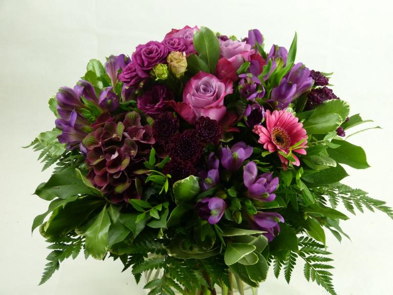 Farbkraft, besser lässt sich diese kräftige Beerenfarbene Kreation nicht umschreiben. Kurz aufgebunden aus Rosen, Lysianthus, Mico,