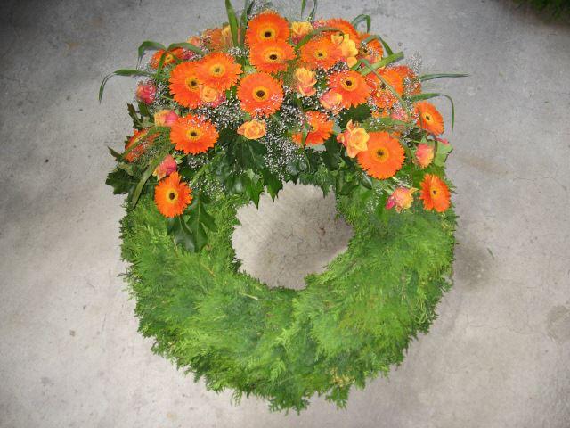 Die Auflage ist gesteckt aus orange Gerbera, orange Rosen, Schleierkraut und Beiwerk.