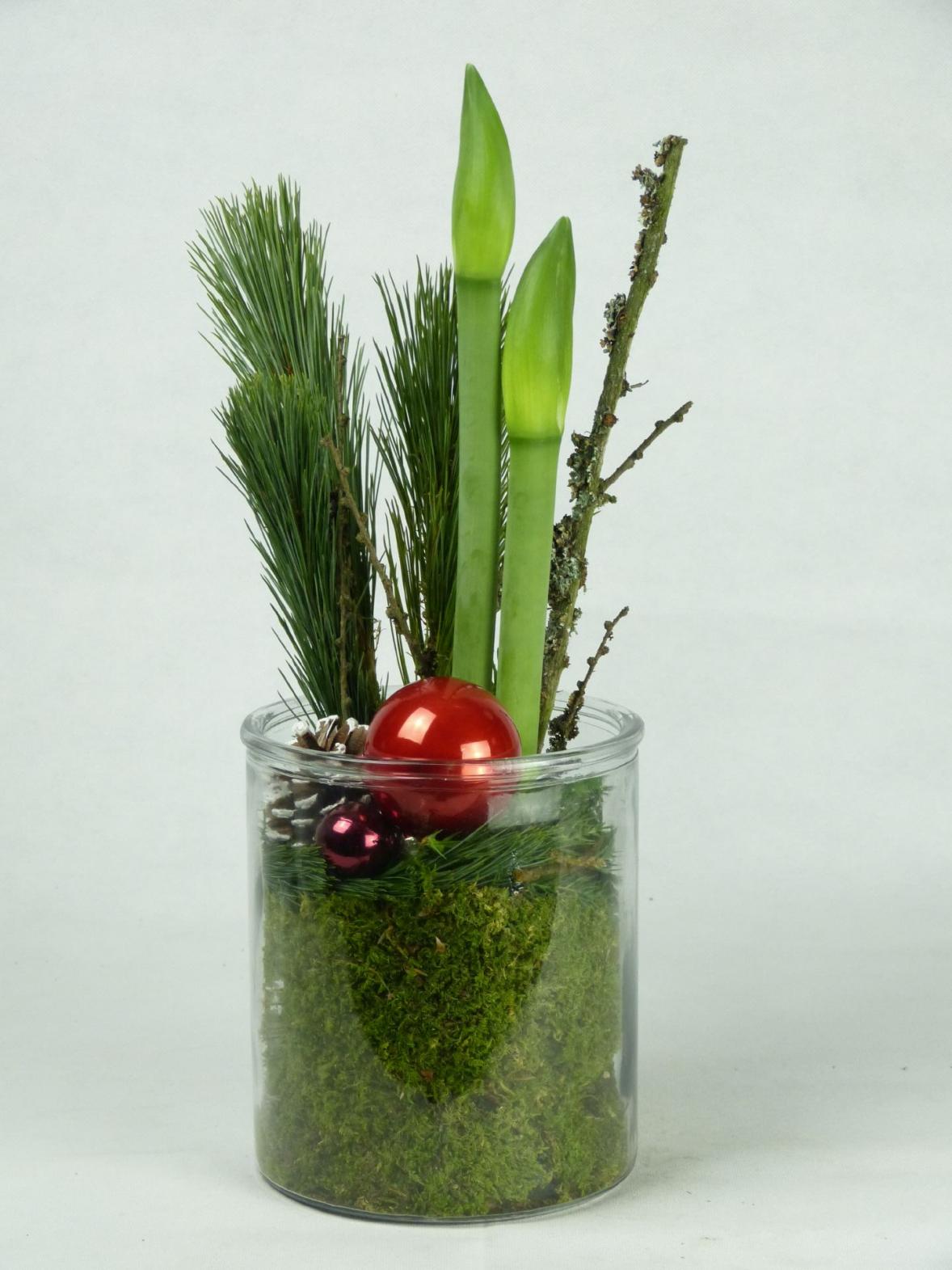 Amaryllis im Glas dekoriert in rot mit Moos, Kiefer, Cryptomerie, Schlehenzweig, Zapfen und Kugel.