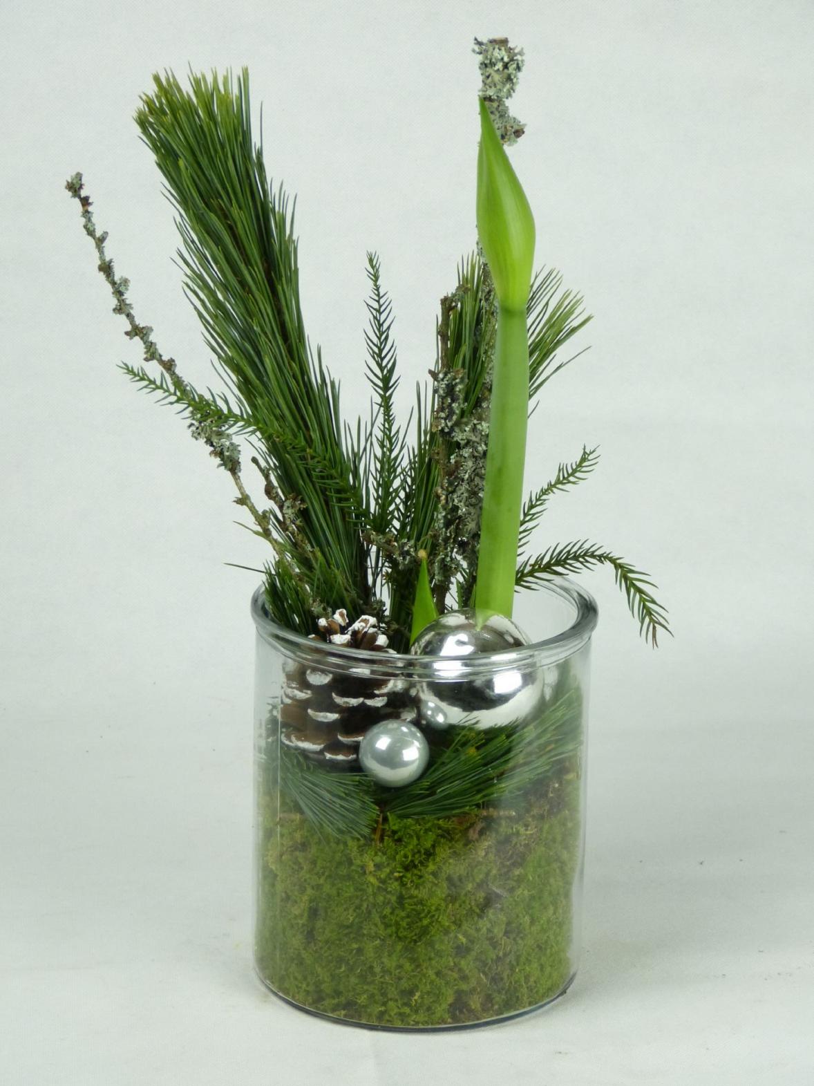 Amaryllis im Glas dekoriert in silber mit Moos, Kiefer, Cryptomerie, Schlehenzweig, Zapfen und Kugel.