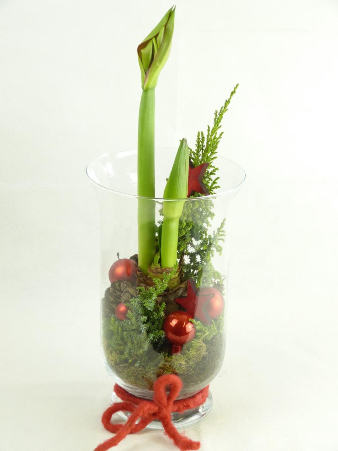 Amaryllis im Windlichtglas mit Weihnachtsschmuck
