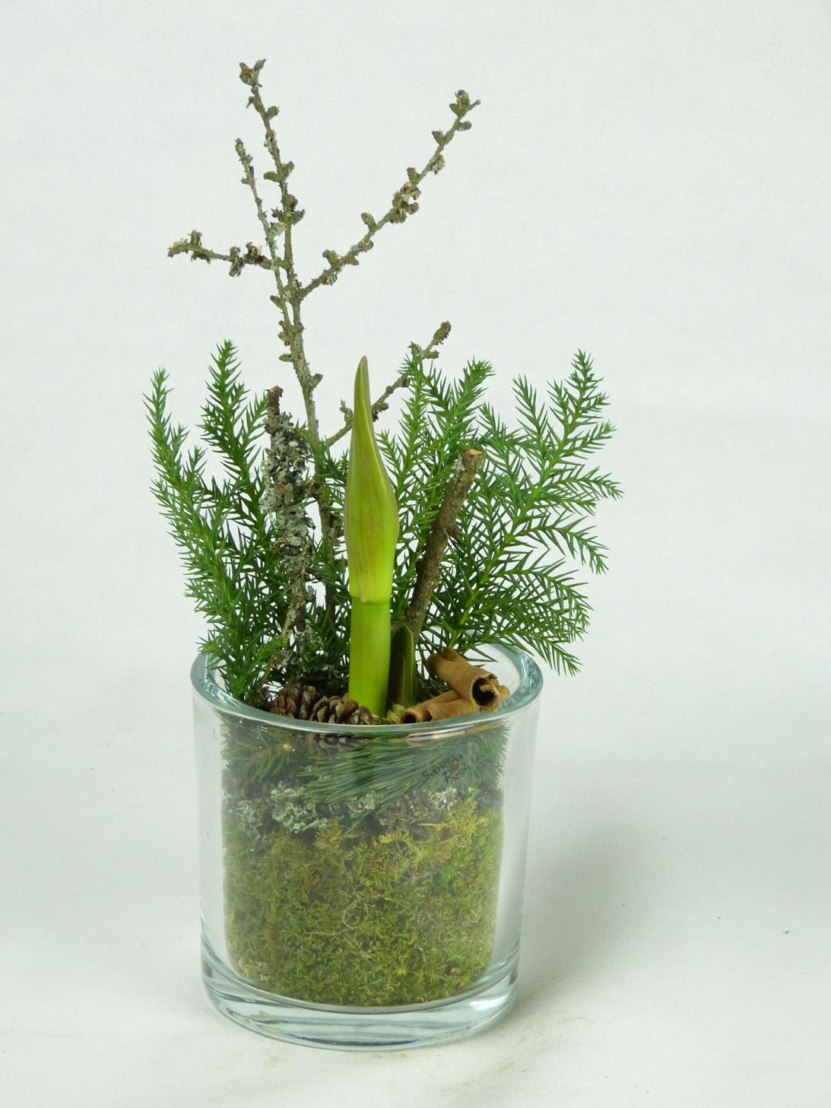 Amaryllis in dickem Glas in Natur mit Cryptomerie, Schlehenzweig, Zapfen und Zimt.